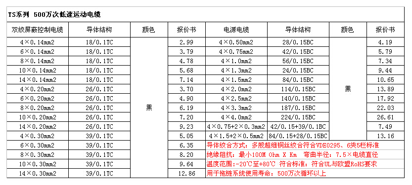 芯線絞合成纜:在室溫下具有極佳的抗酸、堿,適用于無(wú)強(qiáng)應(yīng)力緩釋或強(qiáng)制引導(dǎo)和油脂等特性符合DIN47100色標(biāo)的自由連續(xù)往復(fù)運(yùn)動(dòng)下的安裝及固定敷設(shè)ROBOTFLEX采用特殊耐油PVC混合耐磨外護(hù)套多股細(xì)絞成束銅絲和較小成纜節(jié)距,并在纜芯內(nèi)加入足夠的抗拉纖維。
